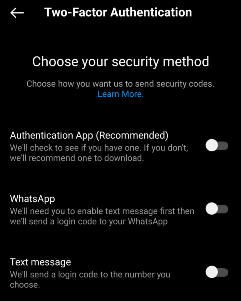 - Next, choose your security method. You can use an authentication app you already have installed on your phone, like Google Authenticator or Microsoft Authenticator. If you don’t have an authenticator app, you can use WhatsApp or Text message as your security method.