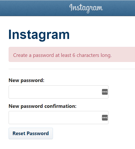 - A browser page will open where you can create a new password for your Instagram account. Enter the new password, new password confirmation, and then select the **Reset Password** button.