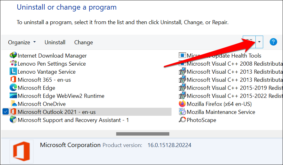 - Switch to a detailed view mode if the Control Panel doesn’t display the “Version” column on the page. To do so, select the **More options** drop-down button in the top-right corner of the app list.