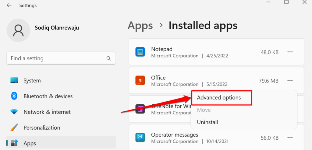 - If Windows doesn’t display the Office version in the app preview, there’s another way to check. Select the **three-dot menu icon** next to the Office application and select **Advanced options**.