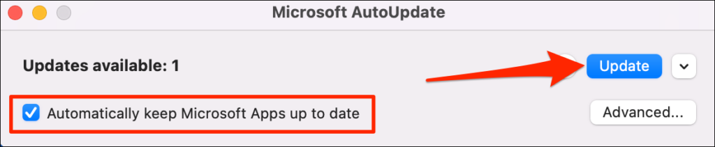 Install and launch the Microsoft AutoUpdate tool and select the Automatically keep Microsoft Apps up to date checkbox. Likewise, select Update to install the latest version of outdated Microsoft apps on your Mac.