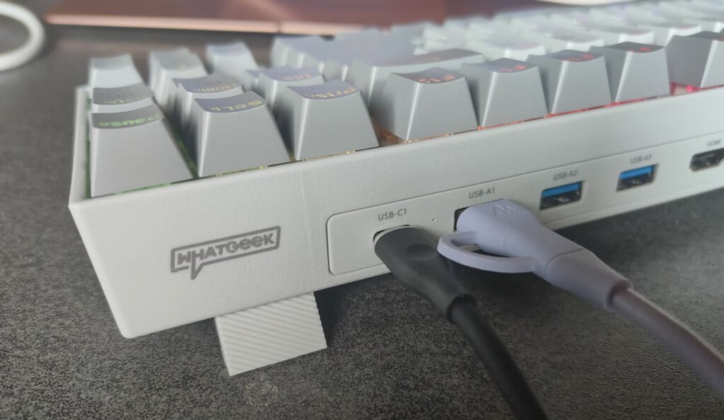 The keyboard’s cable is Y-shaped and has two USB-C connectors on the end. You can use one of them. If you want more power for the ports, like when you want to use one of them as a power bank, it’s recommended to plug in both of the USB-C connectors. One connector provides a total output of 1.5A for a USB-C1 orUSB-A1 port, while two connectors provide 1.5A for both USB-C1 and USB-A1 ports.
