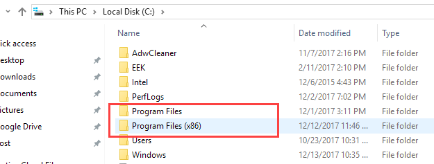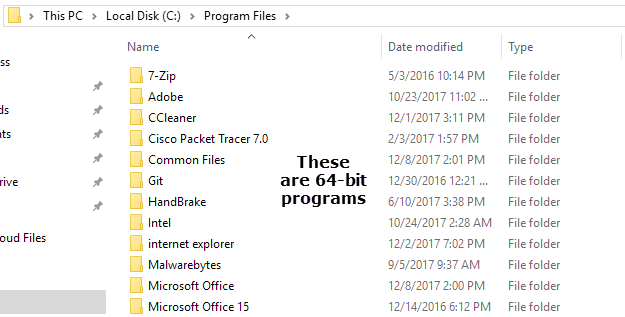 One is simply labeled Program Files and the other is labeled Program Files (x86). The first folder is the default location for all of your 64-bit programs. It does not have an extra label at the end because as a 64-bit operating system, it is assumed that the 64-bit applications will go into this folder.