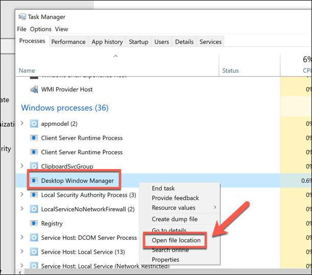 This will take you to the location of the Desktop Window Manager process. If the file location isn’t the **C:WindowsSystem32 **folder, then the running process isn’t the official dwm.exe file.