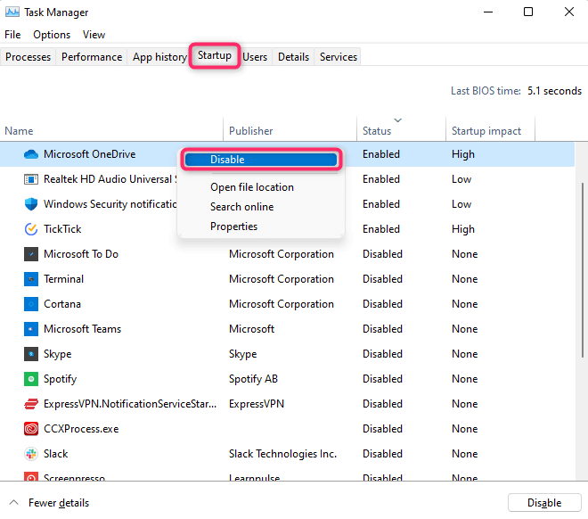 - Right-click on a program in the list and select Disable. Repeat for all programs you want to disable, especially ones with a **“High”**Startup impact.