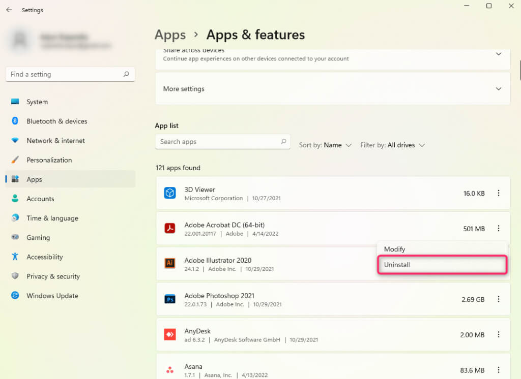 Another way to uninstall bloatware is using the Settings app.