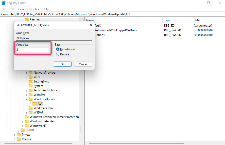 - Double-click on AUOptions and change the value to 2.
