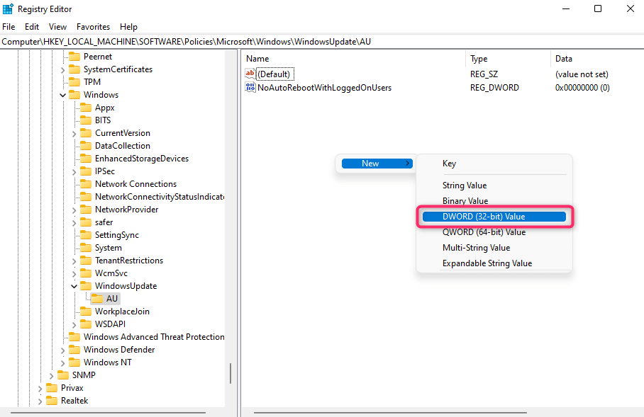 - Select the AU key, right-click in the whitespace in the right pane, and select **New **> **DWORD****Value**. Name the value **AUOptions**.