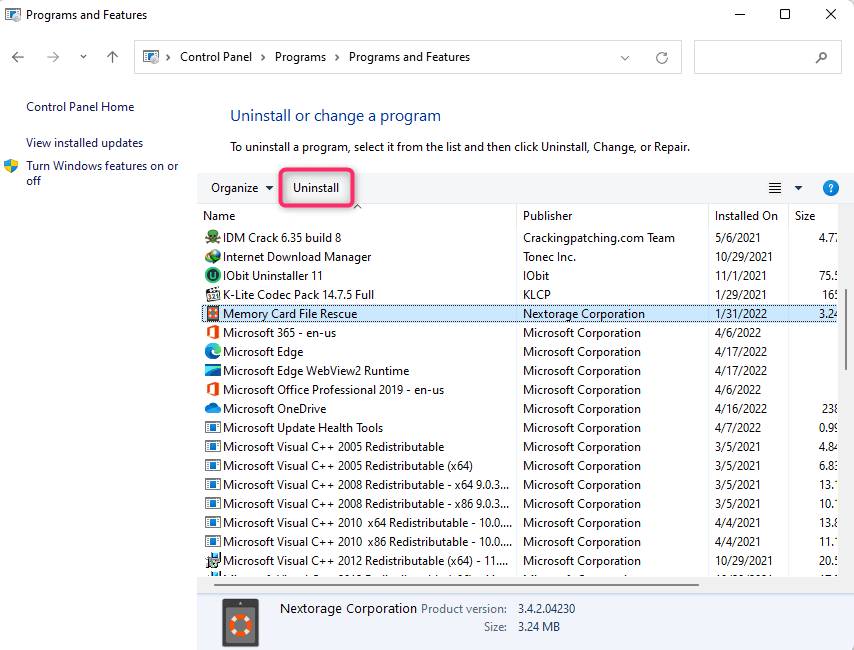 - Select the program you want to uninstall and select the **Uninstall** button at the top.