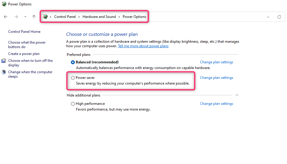 You can deactivate the Power Saver mode by plugging the charging cable into the laptop. If you don’t have access to the charging cable, you can also go to **Control Panel **> Hardware and Sound > Power Options and select a different power plan.