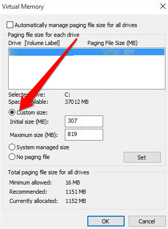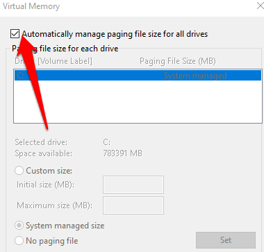 - If you know your device’s RAM, set it as the initial size (in MBs) and set the maximum size as double the RAM size. Select **Set > OK** and reboot your computer.