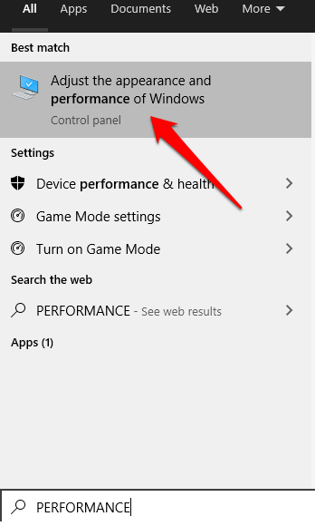 - To do this, right-click Start > Search and type Performance in the search box. Select Adjust the appearance and performance of Windows.
