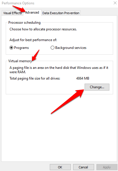 - Next, select **Advanced** tab, go to **Virtual Memory** and select **Change**.