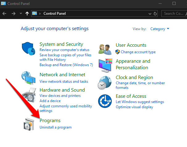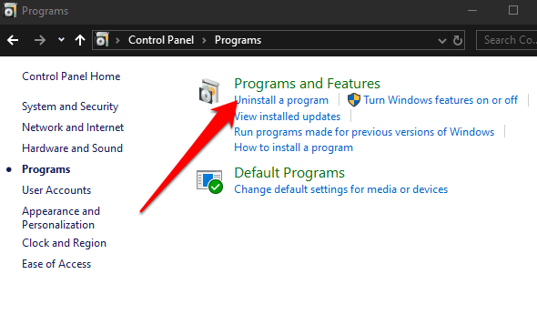 - Next, select **Uninstall a Program** under the **Programs and Features** section.