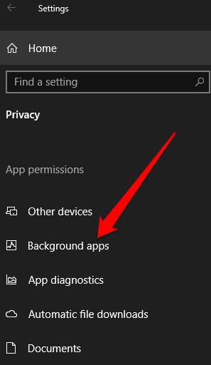 - To prevent apps from running in the background, select **Start > Settings > Privacy > Background Apps** under **App Permissions**.