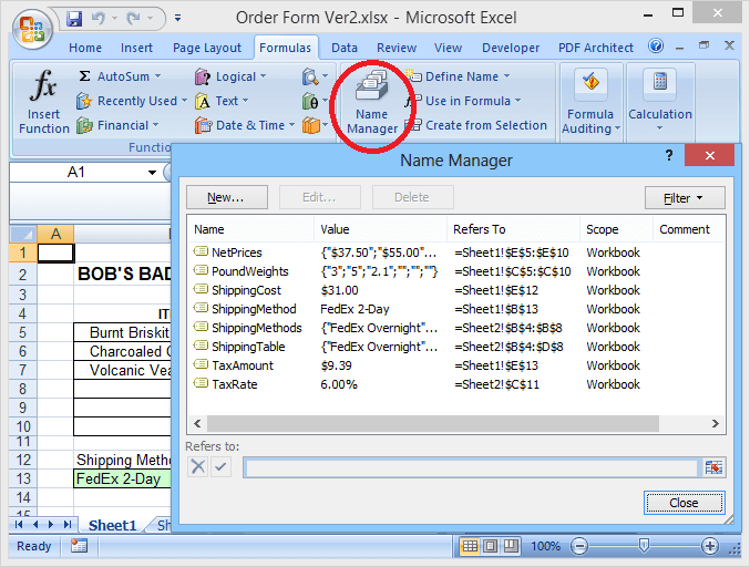 Opening the Name Manager window from the Formulas tab displays a list of the range names and the cell ranges they reference.