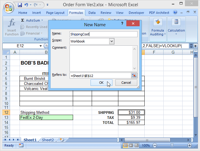 But named ranges have other benefits also. In our example files, the shipping method is selected using a dropdown (data validation) in cell B13 on Sheet1. The selected method is then used to lookup the shipping costs on Sheet2.