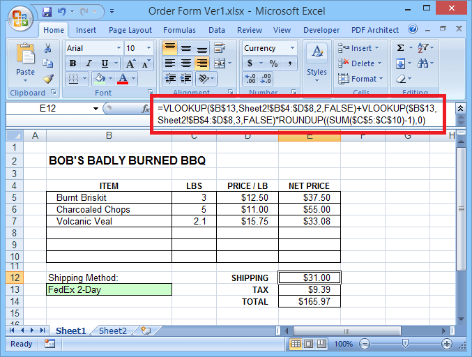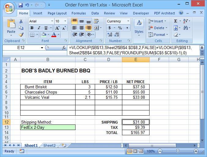 For example, let’s look at a simple order form. Our file includes a fillable order form with a dropdown to select the shipping method, plus a second sheet with a table of shipping costs, and the tax rate.