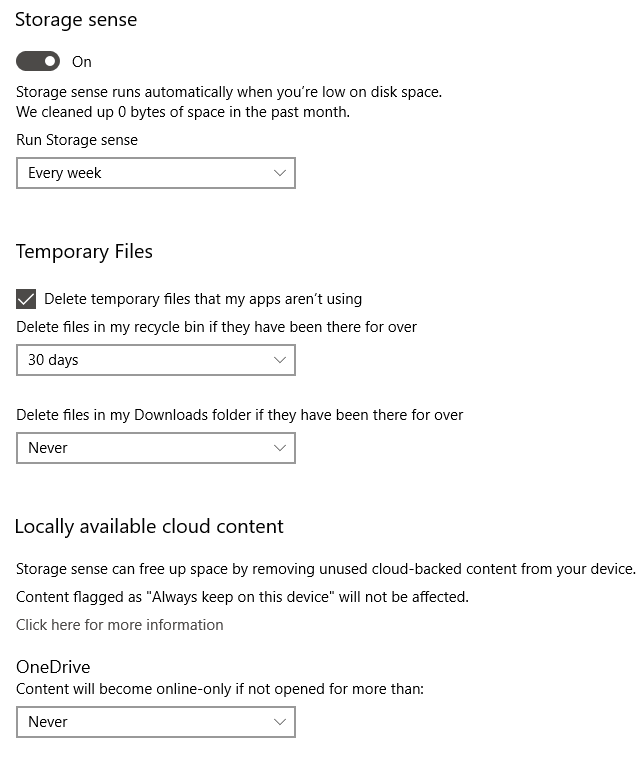 Microsoft introduced a new feature into Windows 10 with Creators Update (version 1709). This introduced a new option in a Windows 10 feature called Storage Sense. This will automatically delete any files in the Downloads folder, temporary files, or the Recycle Bin, that haven’t been changed in 30 days.