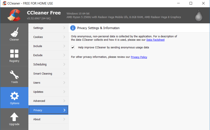 By default, when you install CCleaner, it’s configured to send “anonymous usage data” to CCleaner. The Data Factsheet claims that the only usage that’s monitored is how you use the CCleaner application.