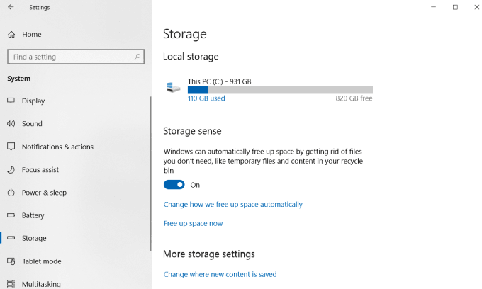 - Click on **System **and then Storage in the left navigation pane.