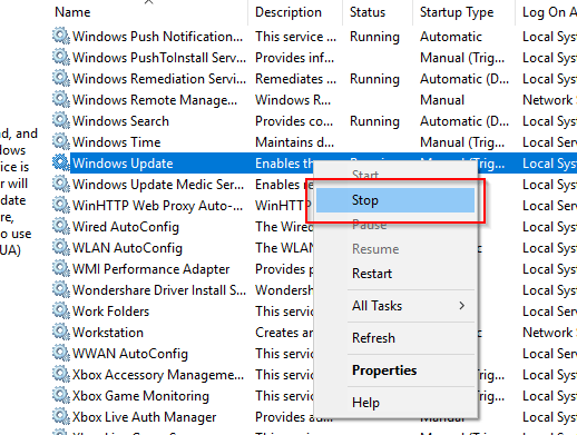 This will launch Services. From the list of applications, right-click Windows Updates and select Stop.