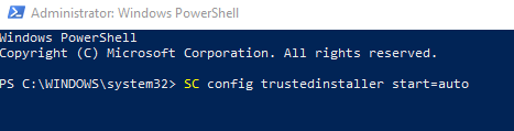 Open PowerShell and enter SC CONFIG TRUSTEDINSTALLER START=AUTO in the command line.