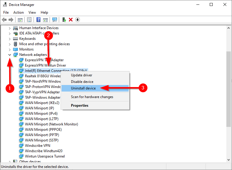 - Look for Network adapters and click on the arrow to its left. Identify the adapter you’re using, right-click on it, and select Uninstall device.