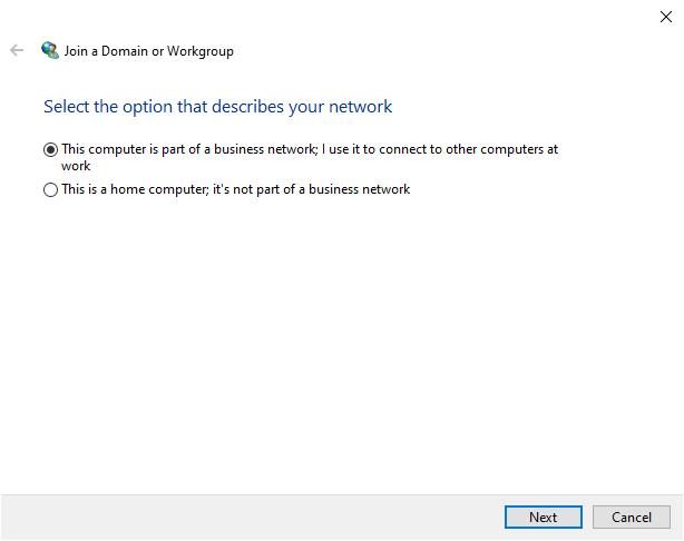 - This will initiate a wizard that will walk you through joining the workgroup. On the first screen, select **This computer is part of a business network; I use it to connect to other computers at work**.