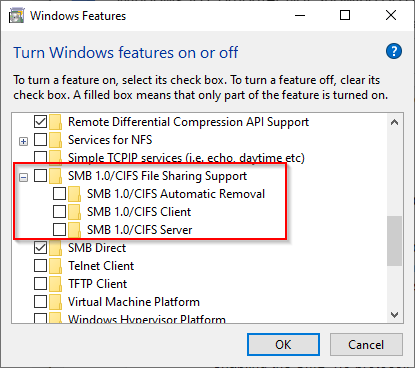 - Look for SMB 1.0/CIFS File Sharing Support and check the box beside it, and press OK.