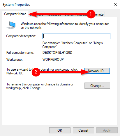 - You’ll now see the **System Properties** window. Switch to the **Computer Name** tab and select **Network ID**.