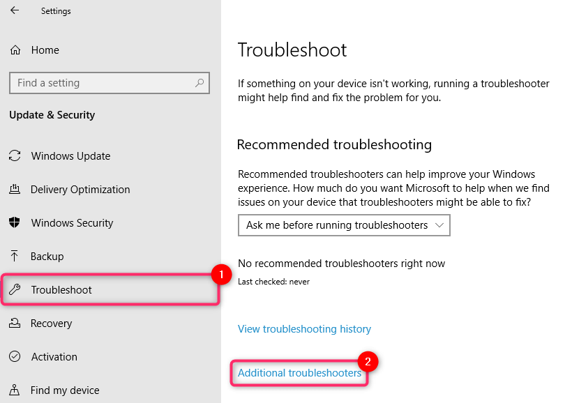 - Select Troubleshoot from the left sidebar and select Additional troubleshooters.