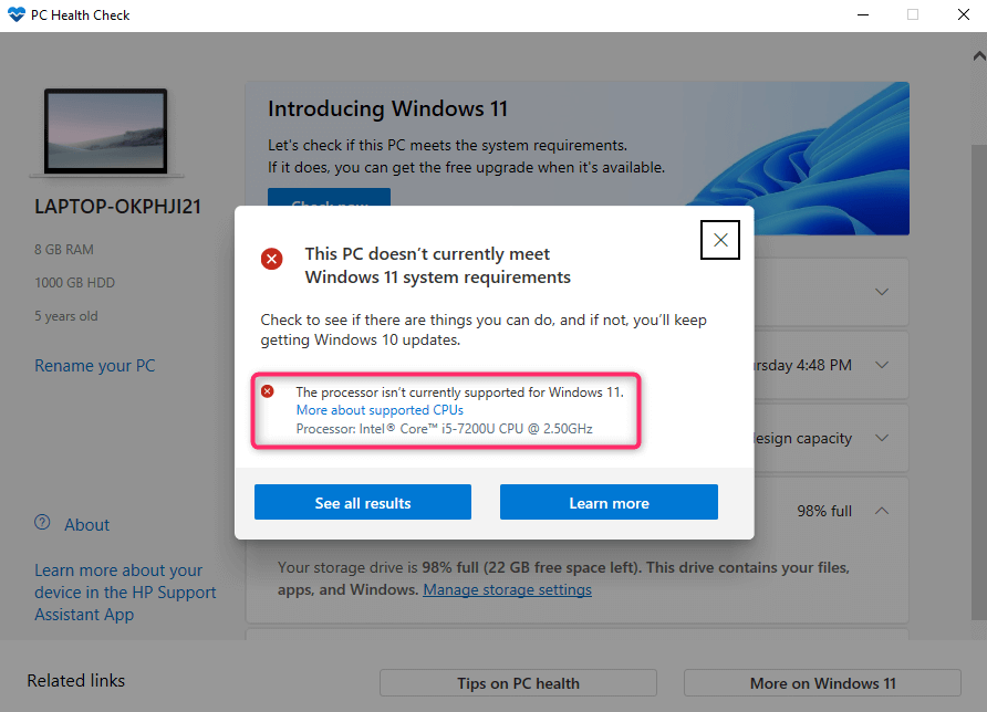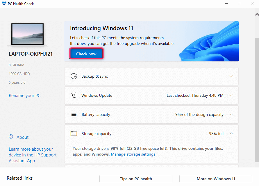 The app will look at your PC’s specs and determine if it can run Windows 11. Suppose one or more components of your PC don’t meet the minimum requirements. In that case, you won’t be able to upgrade to Windows 11 the usual way (though there is a workaround for this).