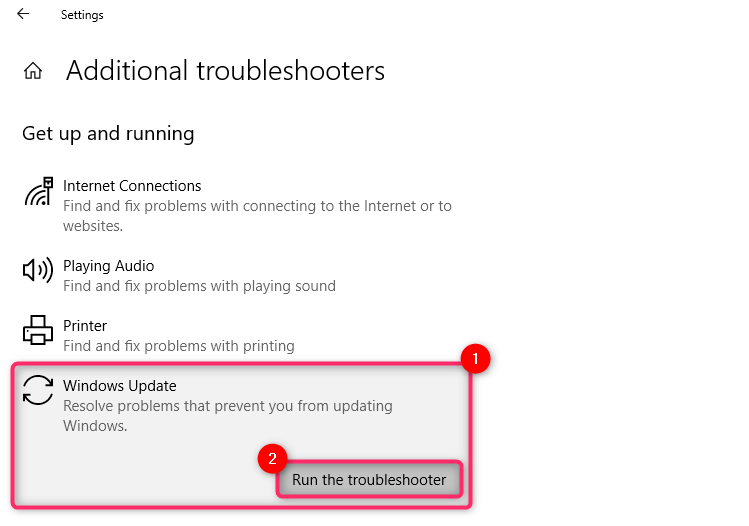 - You’ll see a list of troubleshooters. Select the troubleshooter for **Windows Update **and launch it by selecting the **Run the troubleshooter** button.