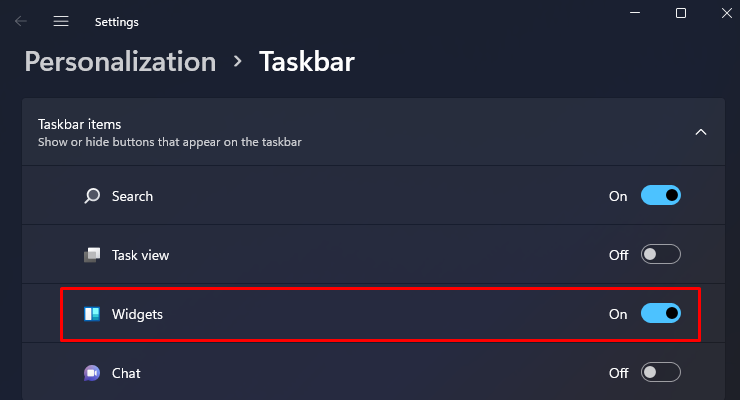 To check the widgets, you can hover your mouse on the Widgets icon in the lower-left corner of your taskbar. If the button is missing, the Widgets feature is probably disabled. To enable it, right-click on the taskbar, select Taskbar settings, and click on the On/**Off **toggle next to Widgets.