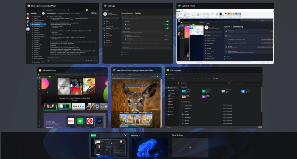 Snap layouts are great, but the maximum view of a program is limited, so why not set up a virtual desktop for each program or each group of programs you need? Just switch from your gaming session back to your work session instantly. In Windows 11 you get greater control over them than in Windows 10 by being able to fully customize each one. For example, in Windows 10 you can’t change the background of a separate virtual desktop.