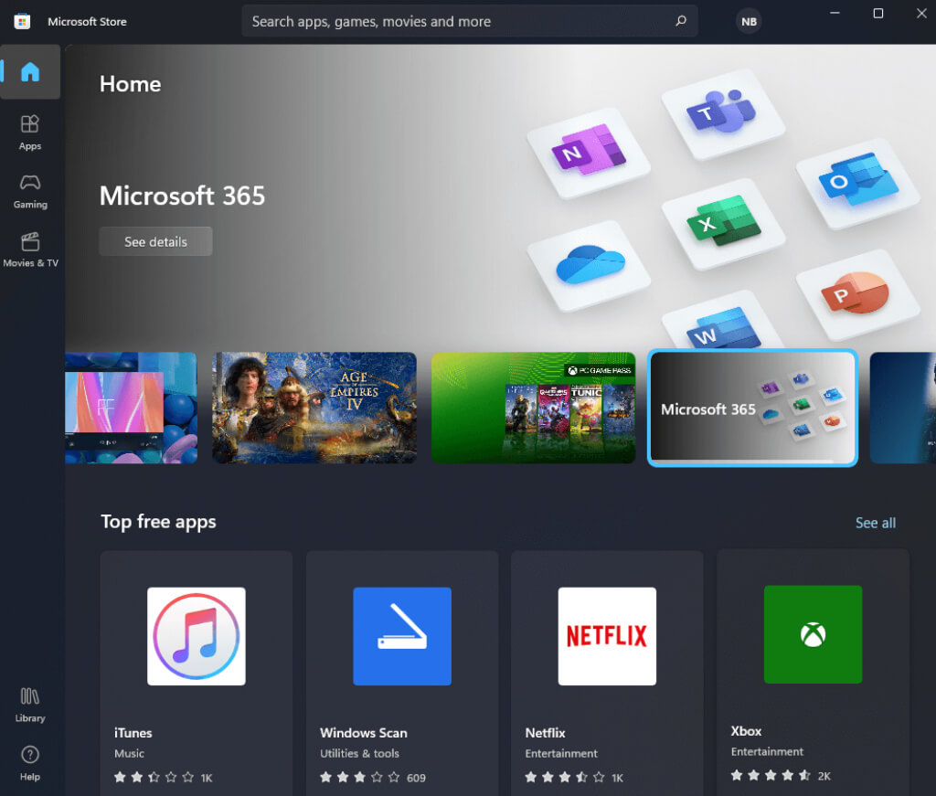 The Microsoft Store is now divided into a control sidebar and a content panel, which feels more modern than the Windows 10 approach. You can choose application categories, run a custom search, and explore the library without wasting time searching for the controls.