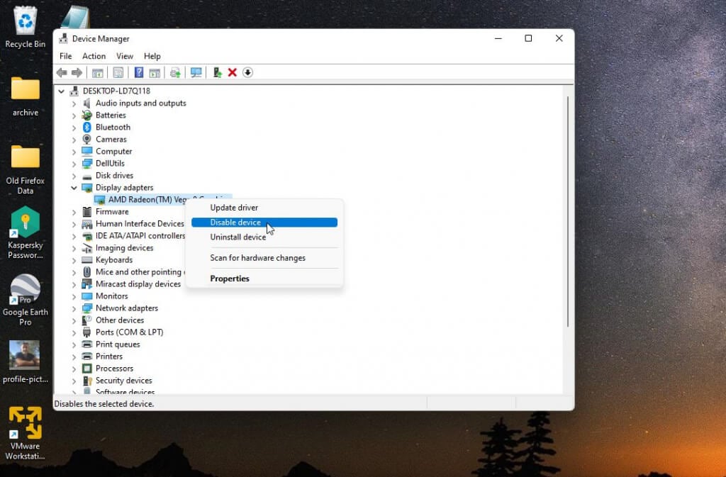 Follow the same steps above to browse to your graphics card in Device Manager. This time, when you right-click on the graphics card, select Disable device.