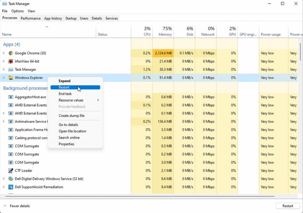 To restart the Windows Explorer process, scroll down the list of processes in the Task Manager again until you find the Windows Explorer process. Right-click the process and select Restart.