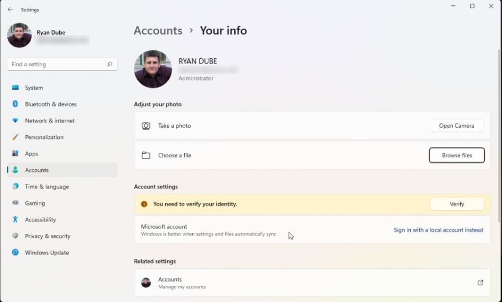 This will open your account info page in Windows Settings. Under the Account settings section, ensure you’re signed in to your Microsoft account. If you’re not, you’ll see a link to Sign in with a Microsoft account instead. Select this and sign into your Microsoft account.