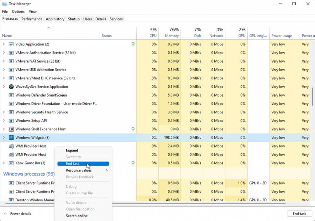 In the Task Manager, make sure the Processes tab is selected. Scroll down the list of processes until you find Windows Widgets. Right-click this process and select End task.
