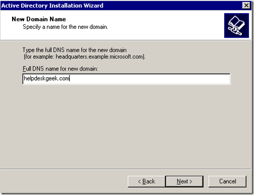In our case, choose the first option, and click Next. On the next screen, we need to type the full DNS name for the new domain: