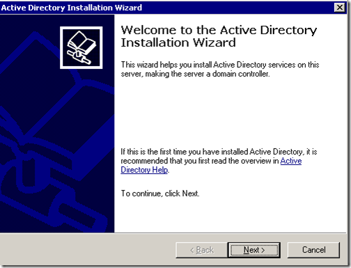 The “Welcome to the Active Directory Installation Wizard” should come up: