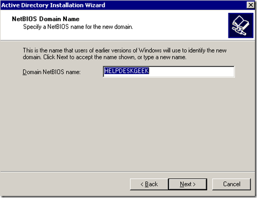 Type the full DNS name like fuck-cs.pp.ua, and click on Next. On the next screen, we need to choose the NETBIOS name. This is the name earlier versions of Windows will be using to identify the new domain.