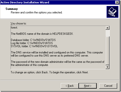 Type your chosen password, and click Next. Next, you will get the summary of all the options you have chosen during the Active Directory wizard. Remember, the domain administrator account password is the same as the current local administrator password.