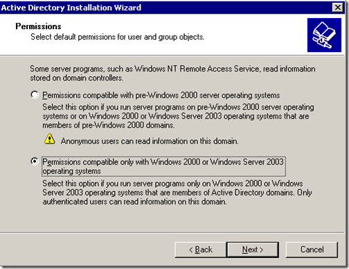 On the next window, you need to choose what type or permissions you want for users and group objects. Here you will get two options. The first options should be selected if you run server programs on pre-Windows 2000 servers. Select option two if you only run Windows Server 2000 and Windows Server 2003 in your domain.