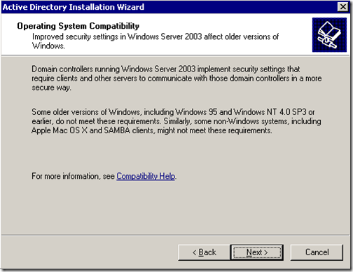 Click on Next. In the following window, you will get a warning about comparability issues with older operating systems. Improved security settings in Windows Server 2003 affect older versions of windows like Windows 95 and Windows NT 4.0 SP3 and earlier.