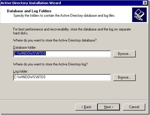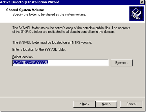 Next, the Shared System Volume window will come up. Here, you need to choose the location of where you want to store the SYSVOL files. This folder contains the domain’s public files and are replicated to all the domain controllers in the domain.