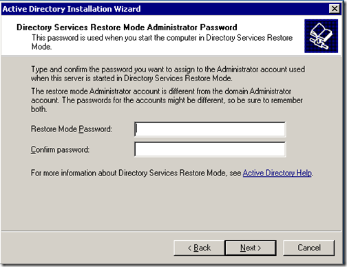 On the next window, you need to enter the Directory services restore mode administrator password. This password is used when you start the computer in directory services restore mode. This account is different from the domain administrator account.