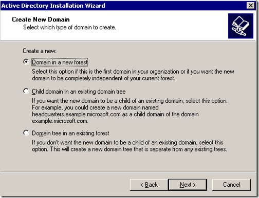 Option two: Child domain in an existing domain tree. Select this option if you want the domain to be a child domain from an existing domain. Option three: Domain tree in an existing forest. If you don’t want any of the above, select this option.